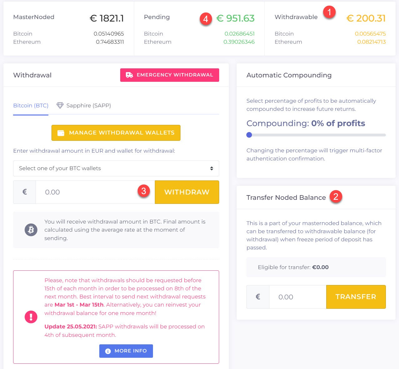Go to Withdrawal. In the top right corner, you see your Withdrawable balance (1). This could be requested to withdraw immediately. Additionally, you see a box with Transfer Noded balance (2). These are the funds that are currently earning a yield, but are already unlocked. Everything you transfer is added to your Withdrawable balance. My deposits are currently locked, that’s why it's showing €0.00 Eligible for transfer for me.